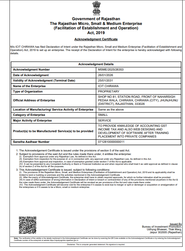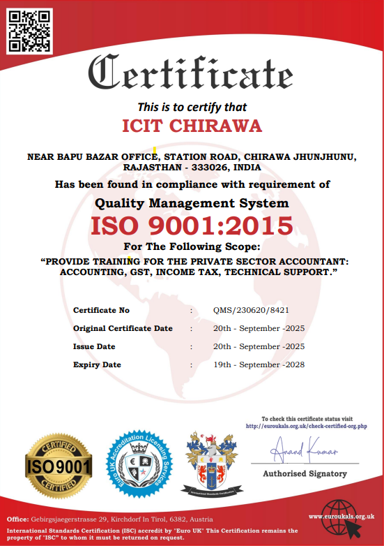 ICIT Chirawa provides professional training in Tally Prime, GST Practical, Income Tax Filing, and Professional Diploma in Accounts & Taxation. Empower your career with industry-level practical knowledge.
